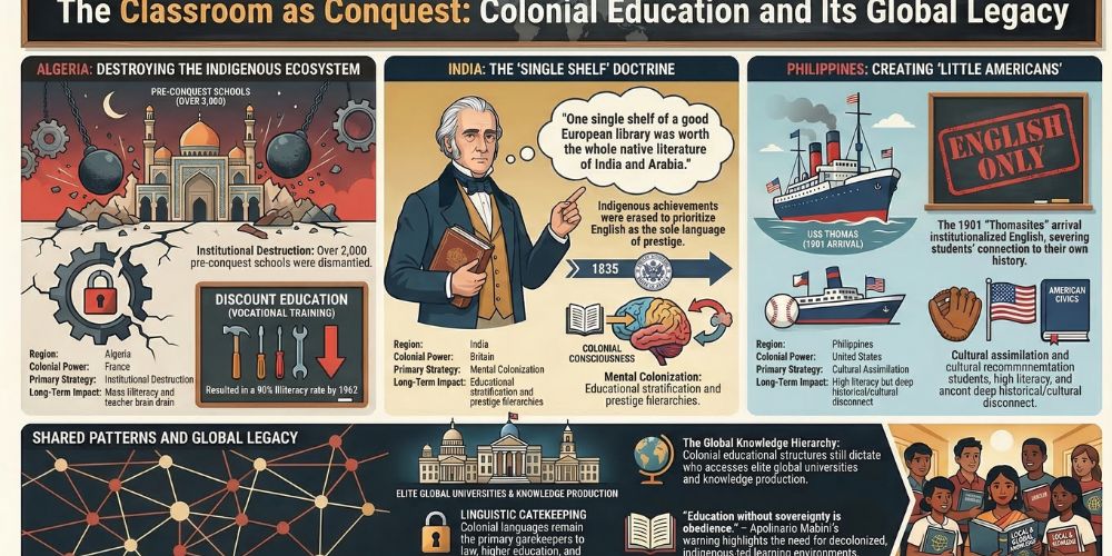 The three case studies examined here reveal a pattern that is devastating precisely because it was intentional. In Algeria, French colonialism destroyed a flourishing indigenous educational system and, for Algerians themselves, put almost nothing in its place—leaving 132 years of accumulated deprivation, mass illiteracy, and cultural dislocation. In India, British policy mounted a more subtle assault: not the outright destruction of schools, but the systematic devaluation of an entire civilization’s intellectual heritage, producing a Western‑educated elite estranged from its own history alongside a vast majority left to navigate a world redesigned around imperial assumptions. In the Philippines, American rule used education as its primary instrument of cultural assimilation, creating within two generations a nation fluent in English and American history but partially severed from its own.​